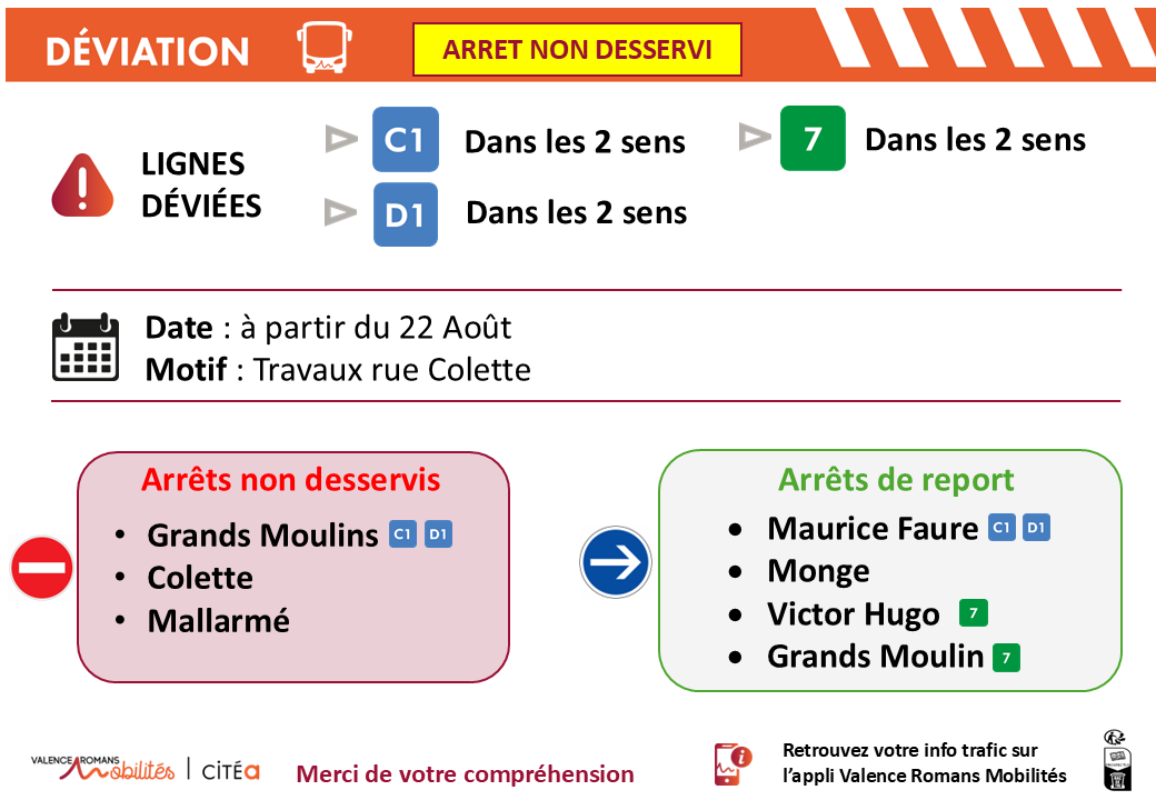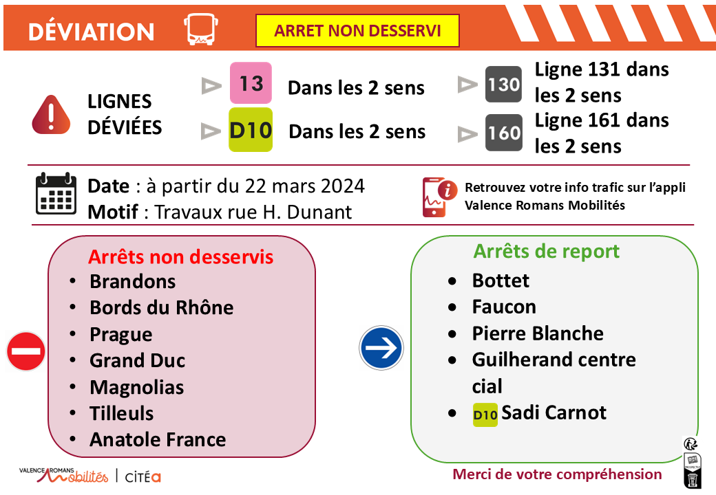 En raison des travaux au centre-ville de Clérieux, les arrêts Usine et Ancienne Gare ne sont pas desservis.